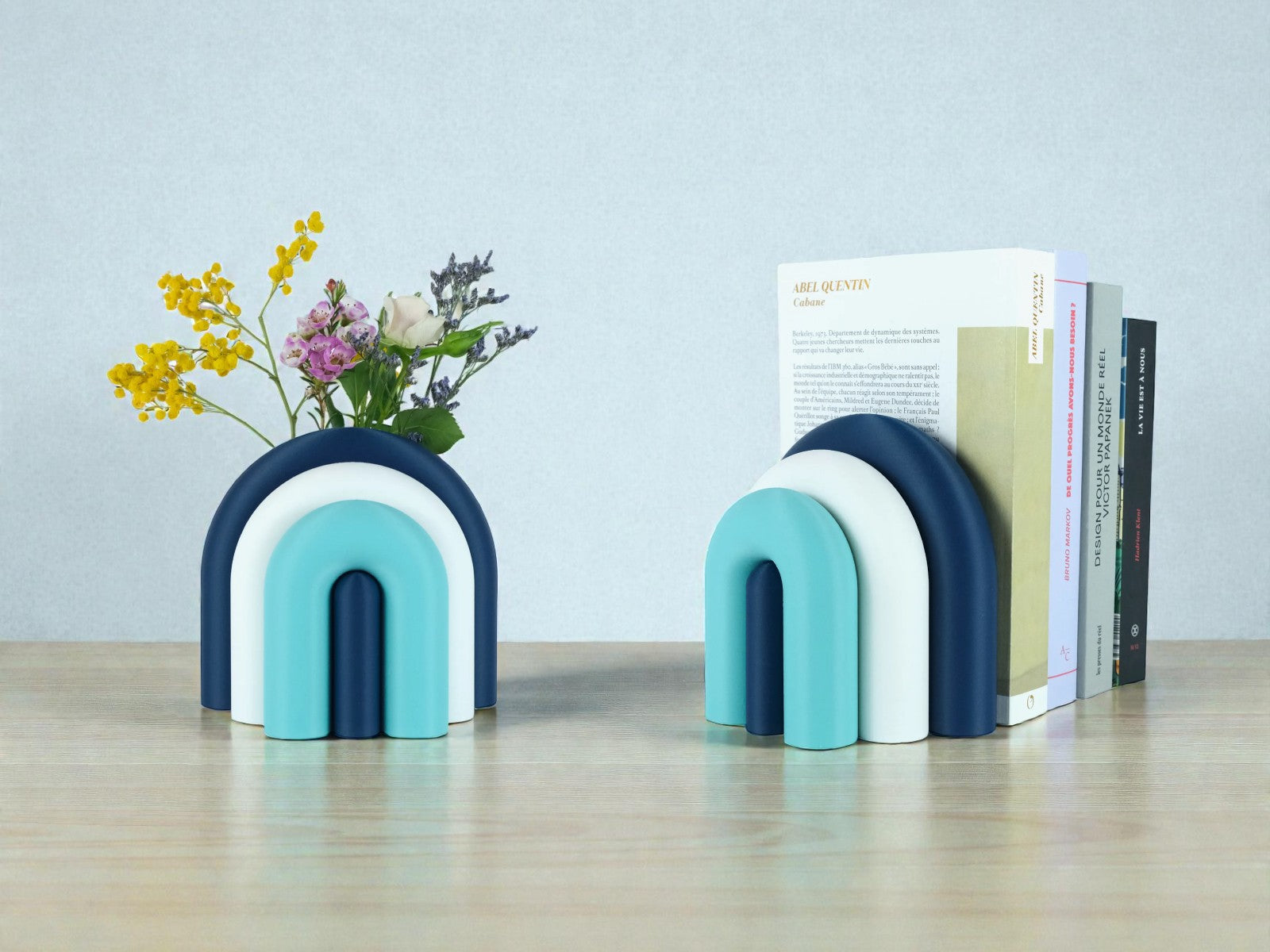 Une présence graphique. Un objet deux-en-un. Arc redéfinit le serre-livre design à travers une silhouette architecturale et évolutive. Son module complémentaire transforme votre serre-livre en vase en un seul geste.