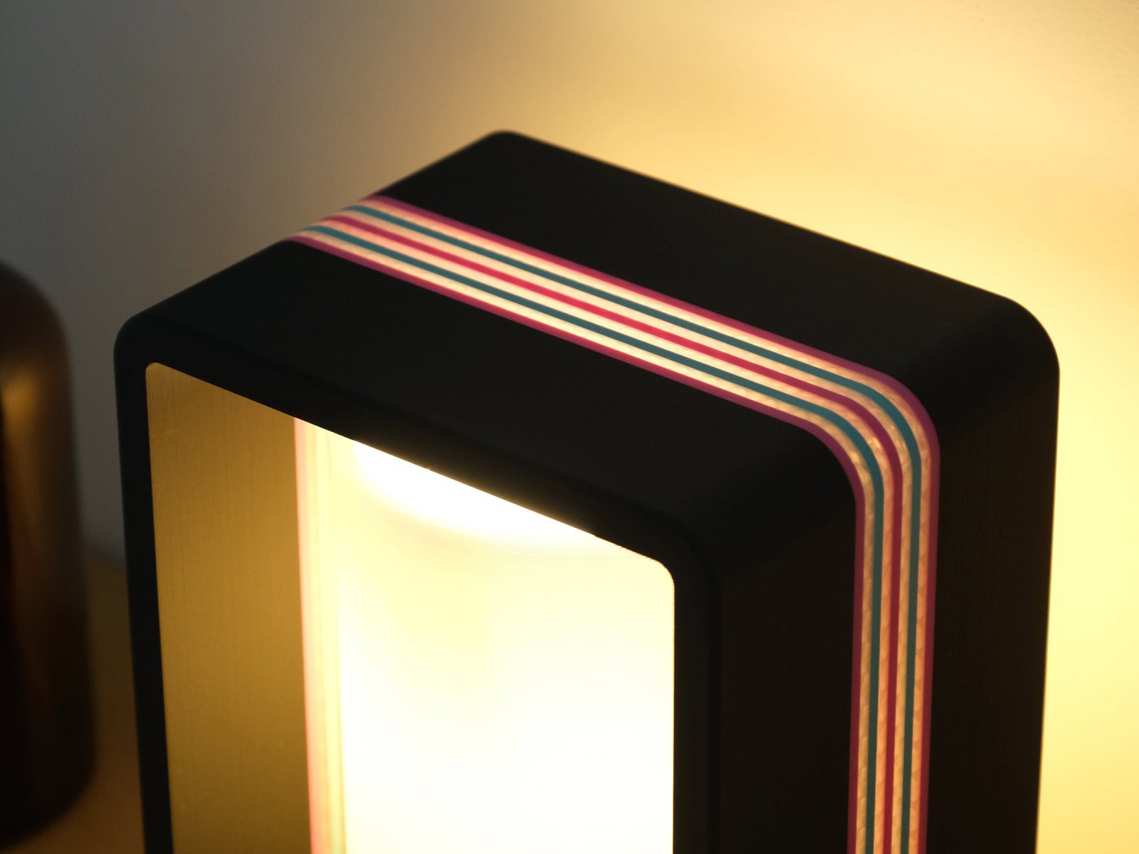 Une présence géométrique. Une lumière habitée. La lampe design Interstice redéfinit l’éclairage d'ambiance à travers une silhouette rectangulaire aux détails graphiques.